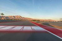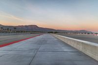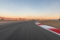 A winding race track curves through the hard shadows of dawn in the USA, stretching straight down the road and disappearing into the clouds.
