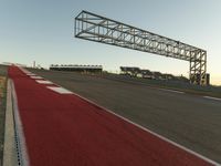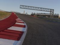 A view of a race track curve with a fixed link infrastructure, lane lines, and a clear sky above the grandstand and road surface.
