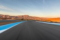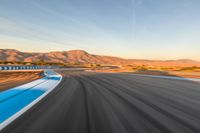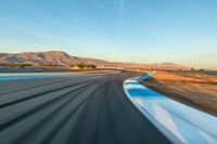 The sun rises over a race track in the USA, casting a hard shadow as the asphalt curves and straightens down the road.