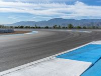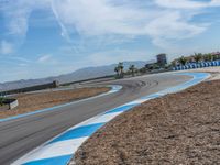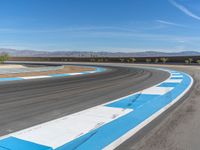 A racecar zooming along the race track in the USA on a sunny day, the asphalt stretching in a curve and a straight line ahead beneath the clouds.