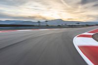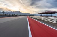 Early morning on a race track in the USA, the asphalt running straight down the road, with a gentle curve in the distance, and the sky a mix of clouds and the break of day.