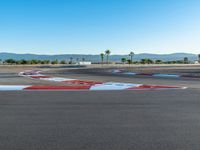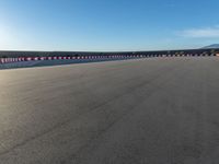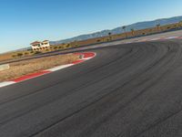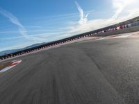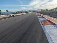 A race car speeds down an asphalt road in the United States at dawn, its profile silhouetted against the clouds as it curves straight down the track.