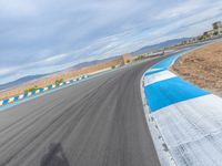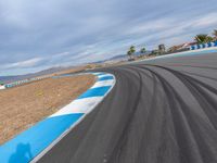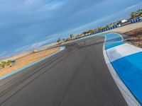A race car speeds down an asphalt road, its driver pushing to get ahead on the curved track as the sun rises on a new day.