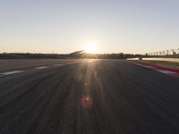 A lone car drives down an asphalt highway, its headlights illuminating the straight line down the road. The sun rises in the clear sky, lighting up the sunlit fields and surrounding infrastructure. The sun is visible, signaling the start of the race track ahead.