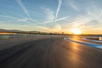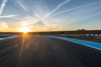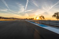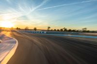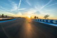 A race track curves straight down the road as the sun rises in the asphalt of the USA on a sunny, cloudless morning.