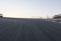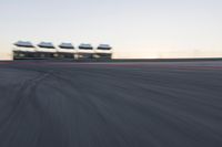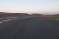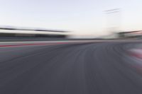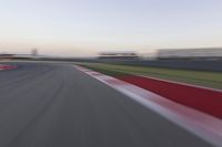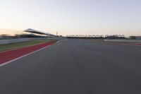 A red automobile races down a winding road surrounded by sand, a clear sky, and a distant grandstand. The asphalt road surface is lined with a switchback S-curve, a straight down the road line and a structure with a roof. Automobile racing and air travel are modes of transport in this landscape of a fixed link, infrastructure, and a race track under the sunlight.