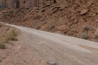 a dirt road and a large cliff face down the side of it that has a small red bus parked on the side of it