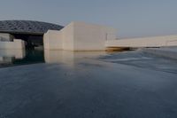 The dawn sun reflects off the concrete and glass facade of the Louvre Abu Dhabi, located in the United Arab Emirates. The open space allows sunlight to penetrate the building, creating a dazzling light show across the lake's surface, which is frozen in the winter months. Ice and asphalt cover the roads and rooftops, while the clear sky and clouds hang above, creating a striking contrast between the building and its surroundings.