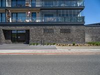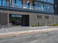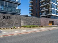 A view of the modern architecture and urban design of a residential area in Bremen, Germany. The brickwork building facade, city streets, and parking lot are illuminated by the warm light of the clear blue sky, with a tree providing a bit of shade.