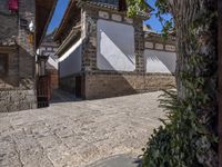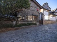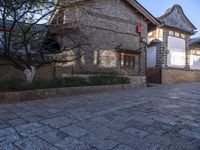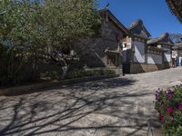 A classic residential building in the old town of Shangri-La, Yunnan, China is seen in this spring day. Its cobble stone road, stone walls, and shed are part of the rich historic architecture, real estate and human settlement of the neighborhood. The surface of the path, the tree and the clear sky in the background make a stunning landscape.