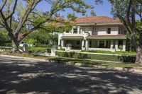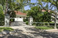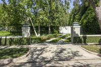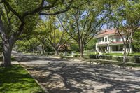 A view of a low residential neighborhood in Los Angeles, California, USA. The asphalt road winds through the property, surrounded by trees and lush vegetation. The clear spring day casts a vibrant green shadow on the suburban landscape.