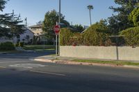 A quiet residential area in Los Angeles, California, USA, as the sun rises over the city. The road, with its smooth asphalt surface, leads through a well-kept neighborhood lined with houses and trees. The infrastructure includes lanes, hedges, and public spaces, creating a pleasant urban environment. This suburb showcases the well-thought-out urban design and provides a peaceful crossing for pedestrians. With a clear sky, it's the perfect start to a new day in the city.