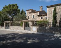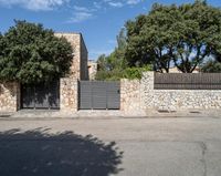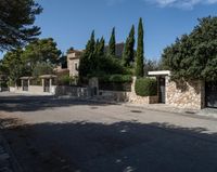 A profile view of a residential area in Mallorca, Balearic Islands, Spain on a clear, sunny day. The asphalt road winds through the city.