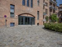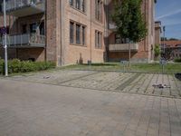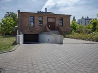 A cobblestone road with asphalt and brick walls lined with residential buildings and open spaces in a classic European urban neighborhood of Berlin, Germany. Trees, parking lots, and parking spaces are part of the infrastructure of this suburban town, with an alley-way, driveway, walkway, and curbs leading to a highway entrance or exit.