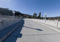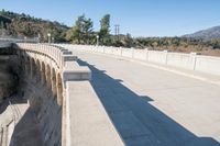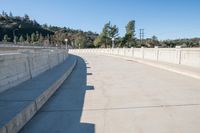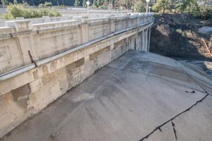 A rugged road winds its way through the low, residential area of Los Angeles, California, USA, while an elevated concrete street curves off in the distance. The clear sky of the day reveals a bridge in the suburban area, leading to the rural high ground.