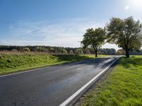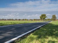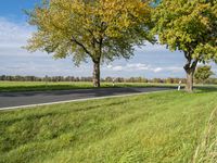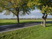 A rural landscape view of the tar road surface leading to Berlin, Germany on a sunny autumn day. The lush vegetation and agrarian fields of the countryside are illuminated by the bright sunlight, with a few clouds in the clear sky. A bike wheel and tire are seen in the foreground, framed by a woody plant with yellow leaves.