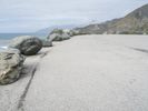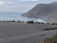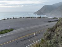 A view of the Pacific Coast Highway in California, USA, at dawn. The coastal landscape features a mix of recreational infrastructure, ocean shore, bluffs, beach, mountain landforms, beach sand, and mountain ranges, making for a beautiful and peaceful overview of the area.
