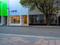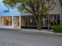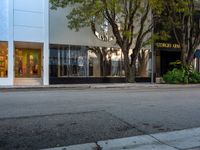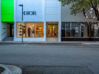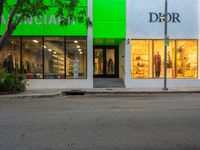 The sun is visible at the break of day in Miami Beach, Florida, USA, as a road follows the urban design of the city, leading to storefronts and shopping opportunities.