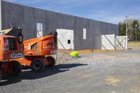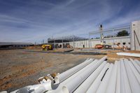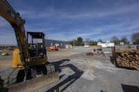 A bulldozer working on a road construction project in Johnson City, Tennessee, USA, with a cloudy sky and open space in the background.