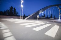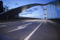 A cable-stayed bridge illuminated by artificial light at night in Frankfurt, Germany. The city's metropolitan area is seen in the horizon, with a clear sky and contrails in the atmosphere. An automobile is seen on a curved road, driving along the switchback highway with a yellow lane on the road surface. The structure of the extradosed bridge, a fixed link, a mode of transport, and the street light provide the atmosphere of road trip in the metropolis.