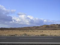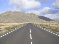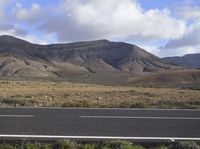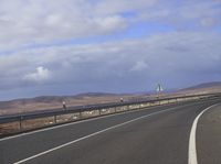 A winding lane along a highway in Fuerteventura, Spain, leading through a rugged steppe landscape and surrounded by the mountain range of the highlands. The Armco barrier offers a sense of safety and security as the road curves around the mountain and into the wild wilderness, while the clouds above provide a natural environment and the asphalt below a smooth road surface.