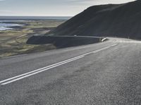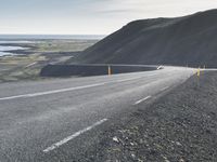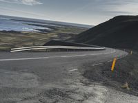 A winding road stretching along a grey beach and clear blue waters in Iceland, surrounded by a natural environment of mountains, highlands, and lakes, with a sunny horizon in the distance.