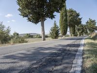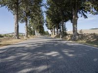 A winding road made of asphalt with a tree-lined alley in a rural landscape of Tuscany, Italy. A clear sky casts a shadow on the road surface and the surrounding natural environment, creating a scenic path for travelers to explore.