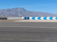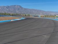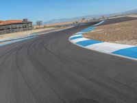 A race car speeds along an asphalt curve in the USA, surrounded by an open expanse of clear sky and straight road ahead.