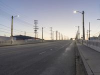 The dawn light illuminates the straight road of the residential area in Los Angeles, California, USA. The infrastructure consists of a bridge, overhead power lines, street lights and a highway fixed link. The asphalt road surface is lined with lanes of transport for the urban city.