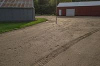 A line of dirt and gravel driveways leads to a house and shed in the rural landscape of Bancroft, Iowa. The road surface is made up of asphalt, grass and soil, and the grey sky provides a backdrop for a glimpse into the rural real estate and agriculture of the area.