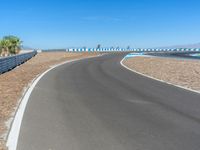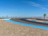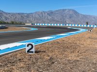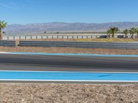 A profile view of a race car racing along a curving asphalt road on a sunny day in the USA.