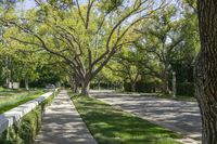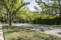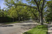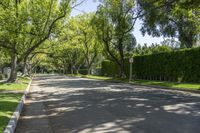 A view straight down the road in a beautiful residential neighborhood of Los Angeles, California, USA. The asphalt road is lined with trees and woody plants, adding a touch of nature to the urban landscape. The clear spring day with a clear sky casts hard shadows on the road surface and surrounding infrastructure. The well-maintained grass lawns and walkways create a pleasant and inviting public space for residents and visitors alike. This suburban suburb is a perfect blend of architecture, nature, and recreational spaces.