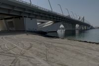 The modern architecture and infrastructure of a coastal urban city in Abu Dhabi, United Arab Emirates, is on display. The concrete bridge, boardwalk, and pier are illuminated by the clear sky in the day, and the road surface, jetty, asphalt, gravel, and wooden walkway all lead to the ocean and harbor in the open space.