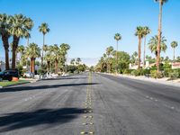 A low angle view of a straight road in the Sonora Desert, California, USA. The view is of a clear sky with a residential mid-century modern architecture, with an asphalt road and palm trees providing an endless view of suburban Palm Springs.