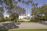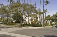 A view of a residential area in Los Angeles, California, USA, on a sunny day. Asphalt roads lined with palm trees, villas, and other woody plants lead to a suburban neighborhood with a variety of architectural styles and real estate properties. The Beverly Hills skyline can be seen in the distance.