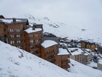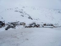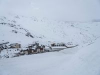 A view of a residential suburb in the French Alps on a gloomy winter day, with snow-covered mountain ranges and a winding road leading up to a scenic overlook. A popular tourist attraction, the Alps provide a magnificent landscape for nature lovers, skiers, and tourists alike.