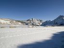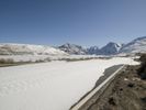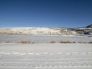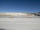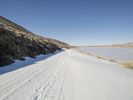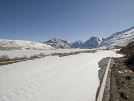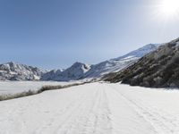 A winding road is visible through the snow-covered mountain range, with bright sunshine and clear skies ahead, stretching far and wide across the wilderness.