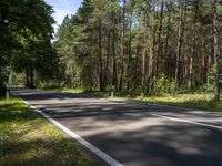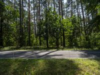 A road stretches through a wooded landscape in Berlin, Germany, with trees and vegetation providing shade and evergreen trees dotting the land lot. The tar road surface is illuminated by sunlight and clear sky, with a hard shadow cast on the asphalt. The natural environment is full of woody plants, with trunks and branches visible in profile.