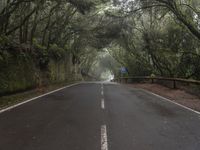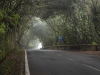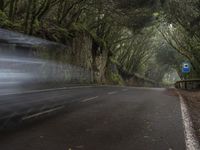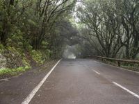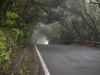 A view of a winding road surrounded by a gloomy forest, fog, and a grey sky in Tenerife, Spain. The foliage, tar, and natural environment create a unique landscape with artificial light creating streaks of light on the road surface.