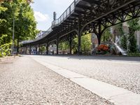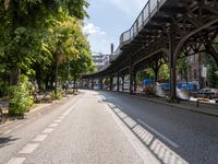 On a sunny day, a road winds through the urban art district of Kreuzberg in Berlin, Germany. The view includes a bridge and underpass, as well as the subway running straight down the street. This area is located in Europe