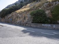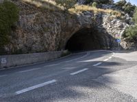 The winding road through the mountain pass in Mallorca, Balearic Islands, Spain, is a thoroughfare of natural beauty, infrastructure, and architecture. The road surface is composed of asphalt, concrete, and rock, with Armco barriers, vegetation, and trees surrounding the pass. The clear sky and geology of the mountainous landscape create a stunning view.