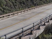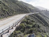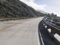 A view of the Pacific Coast Highway winding along the Armco barrier and concrete bridge in Big Sur, California. The S-curve navigates through the coastal mountain range and highlands, creating a stunning landscape of rolling hills, rocky shorelines, and tree-lined roads against a backdrop of clear blue skies.