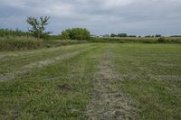 A dirt road stretches out toward the horizon of the Iowa prairie, with a barn and shed in the distance. The grey sky above frames the open field of grass, vegetation, and soil, a rural land lot of farmland and agriculture, perfect for recreational activities.