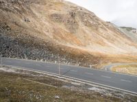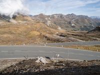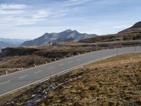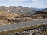 A winding, elevated road curves through the open space of a mountainous Austrian landscape, offering an overview of the clear sky and nature on a sunny day in Europe.