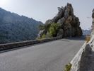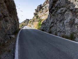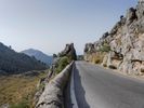 A winding road in the Spanish highlands, with a view of the Balearic Islands in the distance and sunshine illuminating the rocky wall overlooking it