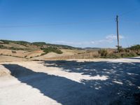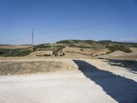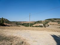 A rugged dirt road lined with trees and harvested gardens winds up a hill in the scenic landscape of Tuscany, Italy, providing a stunning coastal view. The clear blue sky and natural geology of the land lot make this a picture-perfect rural scene.