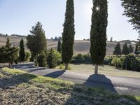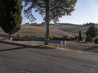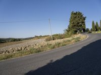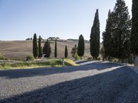 A winding road with a rugged landscape of thuya trees, cypress, grass, and evergreen shrubs against a clear sky in Tuscany, Italy. The sunshine illuminates the road surface and guard rail, providing a glimpse of the spring harvest and the natural beauty of the European biome.