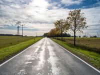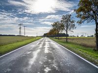 The tar asphalt of a rural road stretches across the German landscape, surrounded by a lush natural environment of vegetation, yellow autumn leaves, and a windmill. The sun shines brightly from a clear sky, illuminating the infrastructure and woody plants of the land lot in Europe.