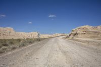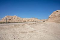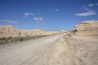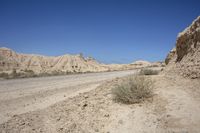 A scenic road winding through the rugged landscape of Bardenas Reales, Navarre, Spain, with rocky outcrops and mountain landforms in the distance.