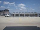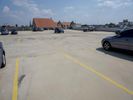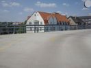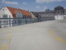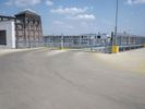 A view of a modern highway entrance in Berlin, Germany featuring a yellow line on the road surface, a guard rail, an entry ramp and a parking lot. The urban infrastructure and clear sky provides a scenic backdrop for this metropolitan area in Europe.